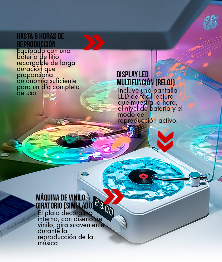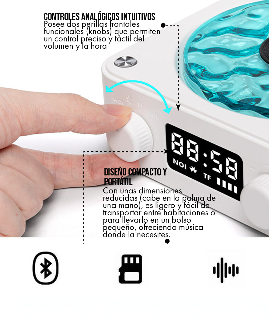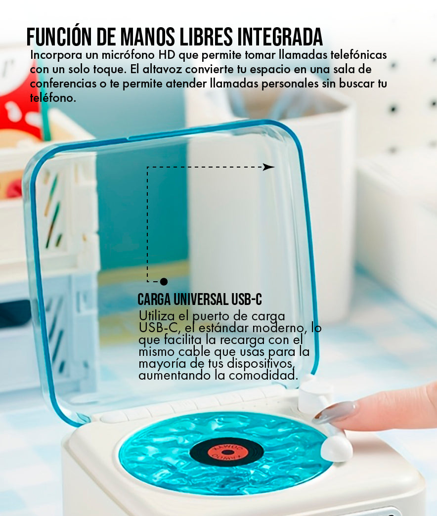 de Ahorro de Espacio: Gracias a su factor de forma mini-compacto, este altavoz ocupa hasta un 55% menos de espacio que un tocadiscos real o un equipo de sonido de escritorio voluminoso, convirtiéndolo en la solución ideal para espacios pequeños.