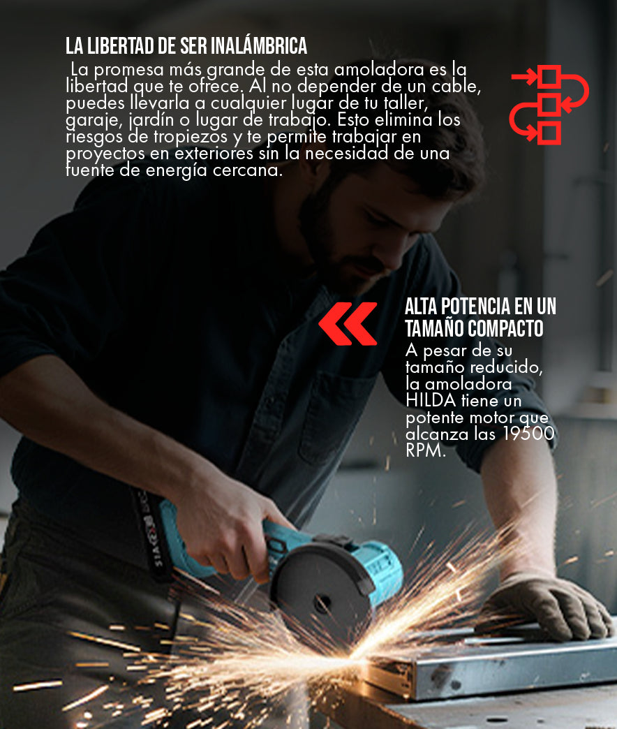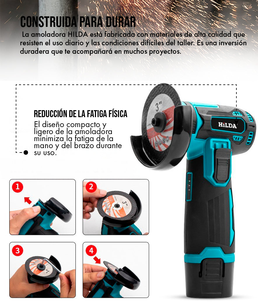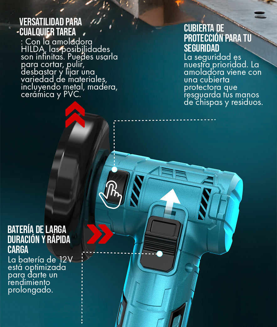 Sí, la amoladora HILDA ha sido diseñada pensando en la seguridad del usuario. Cuenta con un protector de disco ajustable para desviar las chispas y un interruptor de seguridad que previene el encendido accidental. Siempre recomendamos leer el manual de instrucciones y usar equipo de protección personal (gafas, guantes) antes de usar cualquier herramienta eléctrica.