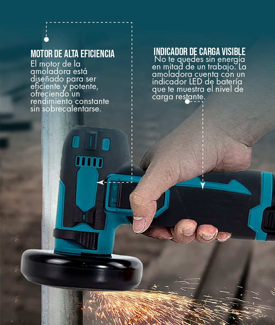 Utiliza una batería recargable de iones de litio de alto rendimiento. La duración de la batería varía según el tipo de trabajo que se realice (corte vs. pulido) y la intensidad de uso. Sin embargo, en un uso continuo promedio, puede durar entre 40 y 60 minutos. El kit de venta incluye una batería de repuesto para que no tengas que detener tu trabajo.