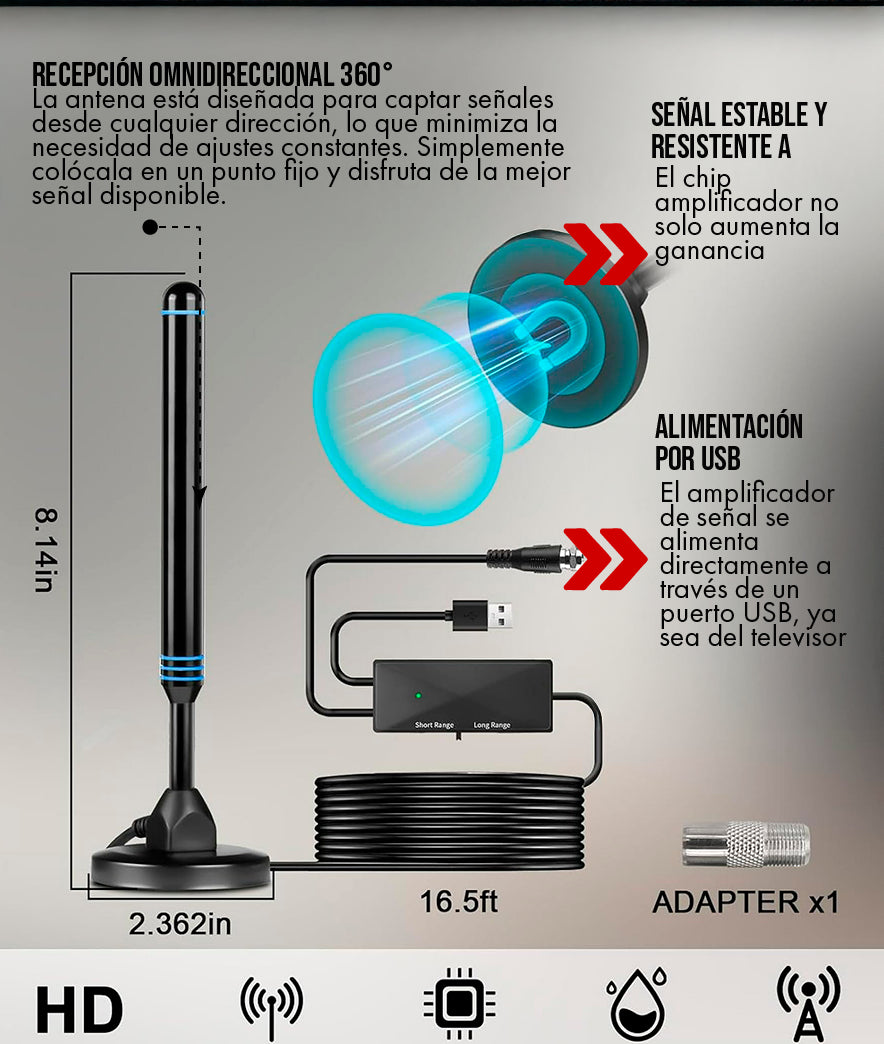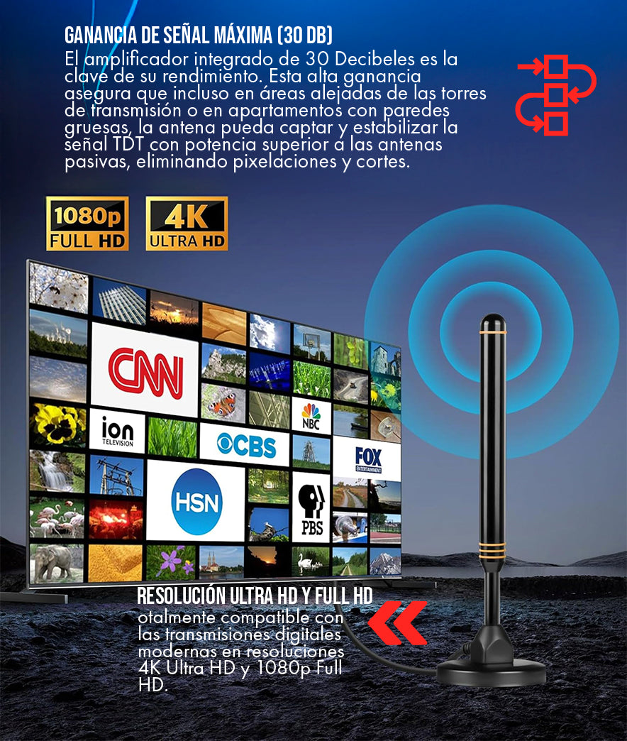 El nivel de 30 dB se refiere a la capacidad de amplificación de la señal. Esto significa que la antena tiene un amplificador de bajo ruido incorporado que toma las señales TDT débiles que detecta y las aumenta en 30 veces su potencia. Esto es crucial para estabilizar la señal, prevenir cortes y pixelaciones, y asegurar la recepción en zonas donde la señal es naturalmente débil o hay muchos obstáculos.