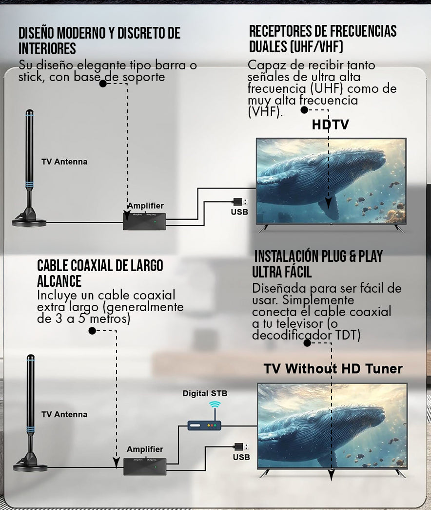La instalación es muy sencilla. Solo necesitas conectar el cable coaxial (incluido) a la entrada de antena de tu televisor (o decodificador TDT). Luego, conecta el cable USB del amplificador a un puerto USB de tu televisor o a un adaptador de corriente. Finalmente, utiliza el menú de tu televisor para realizar una "búsqueda automática de canales" (Auto-Scan).