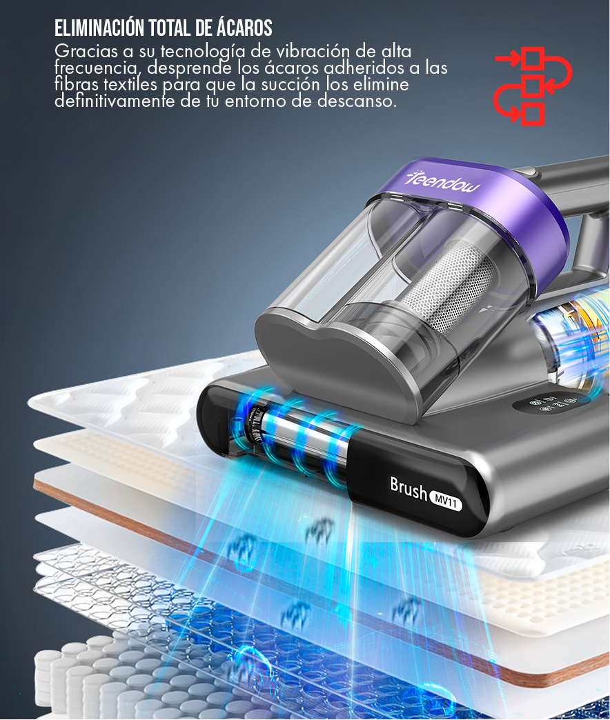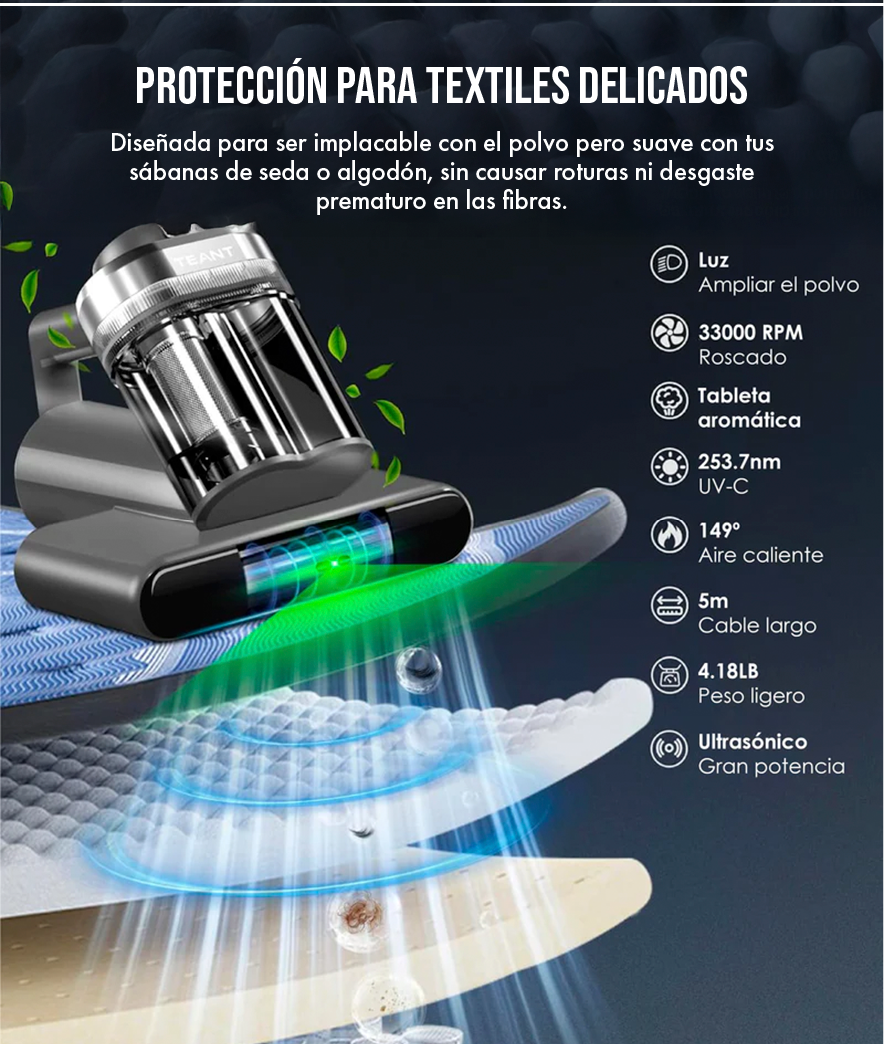 Absolutamente. Su diseño está optimizado para cualquier superficie textil donde el polvo y los ácaros suelan acumularse, incluyendo tapicería de vehículos y alfombras.
