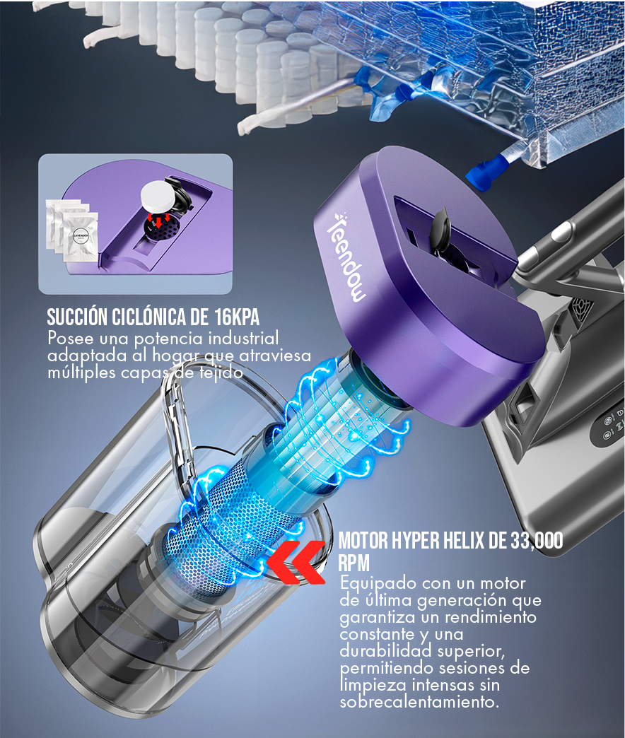 Recomendamos vaciar el depósito después de cada uso y lavar el filtro HEPA con agua fría una vez al mes para mantener la potencia de succión al máximo nivel.