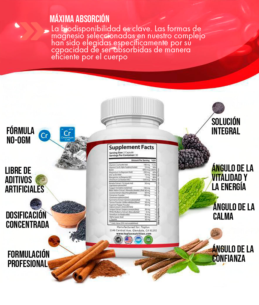 La fórmula combina una amplia gama de extractos, vitaminas y minerales. Los pilares son la Canela, el Cromo (esencial para la función de la insulina) y la Mora. La potencia de 20 ingredientes es importante porque la regulación metabólica es compleja. Este enfoque amplio garantiza que se están apoyando múltiples sistemas: el metabolismo de carbohidratos, la función inmunológica y el bienestar general.