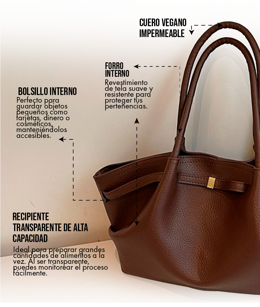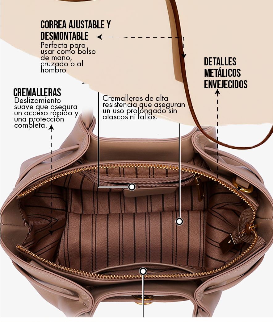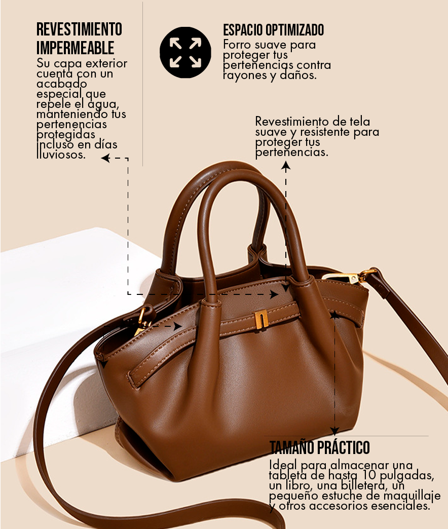 El bolso está fabricado con piel sintética de alta calidad, un material que imita la textura y el acabado del cuero genuino, pero con la ventaja de ser más ligero, resistente a las manchas y de bajo mantenimiento. El forro interior es de tela suave para proteger tus pertenencias.