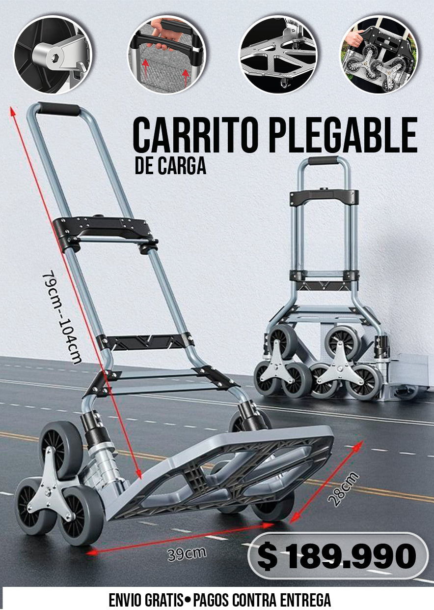 Nuestro carro de carga cuenta con un innovador sistema de 6 ruedas triples, fabricadas con TPR (caucho termoplástico). A diferencia de las ruedas tradicionales, este diseño permite que el carro "camine" sobre los escalones, distribuyendo el peso y reduciendo la fricción. El material TPR es suave y silencioso, resistente a la abrasión y no deja marcas en los pisos, lo que lo hace superior en durabilidad y funcionalidad en cualquier superficie, no solo en escaleras.