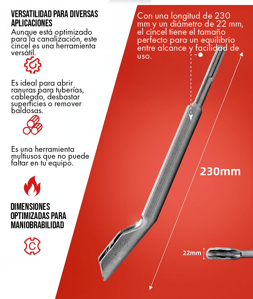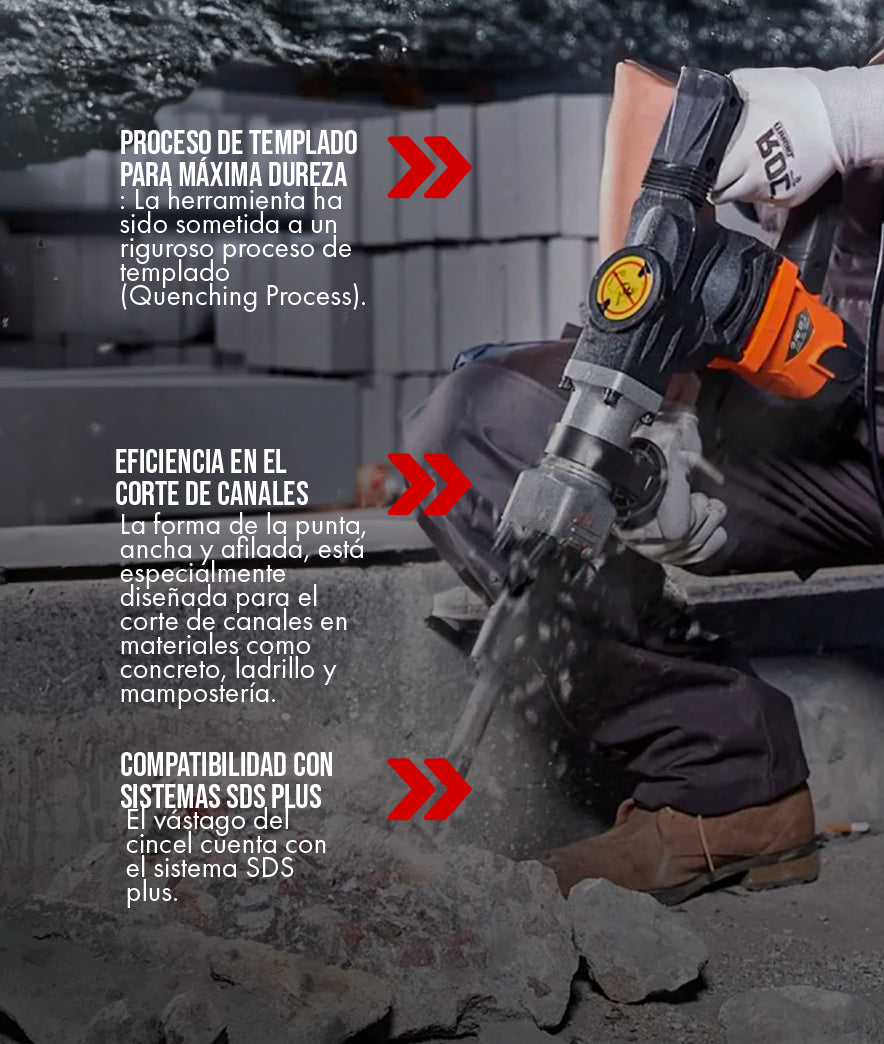 Un cincel canalizador es una herramienta diseñada para abrir ranuras o canales en materiales de construcción duros como concreto, ladrillo, piedra y mampostería. Es ideal para la instalación de tuberías, cableado eléctrico o para trabajos de demolición.
