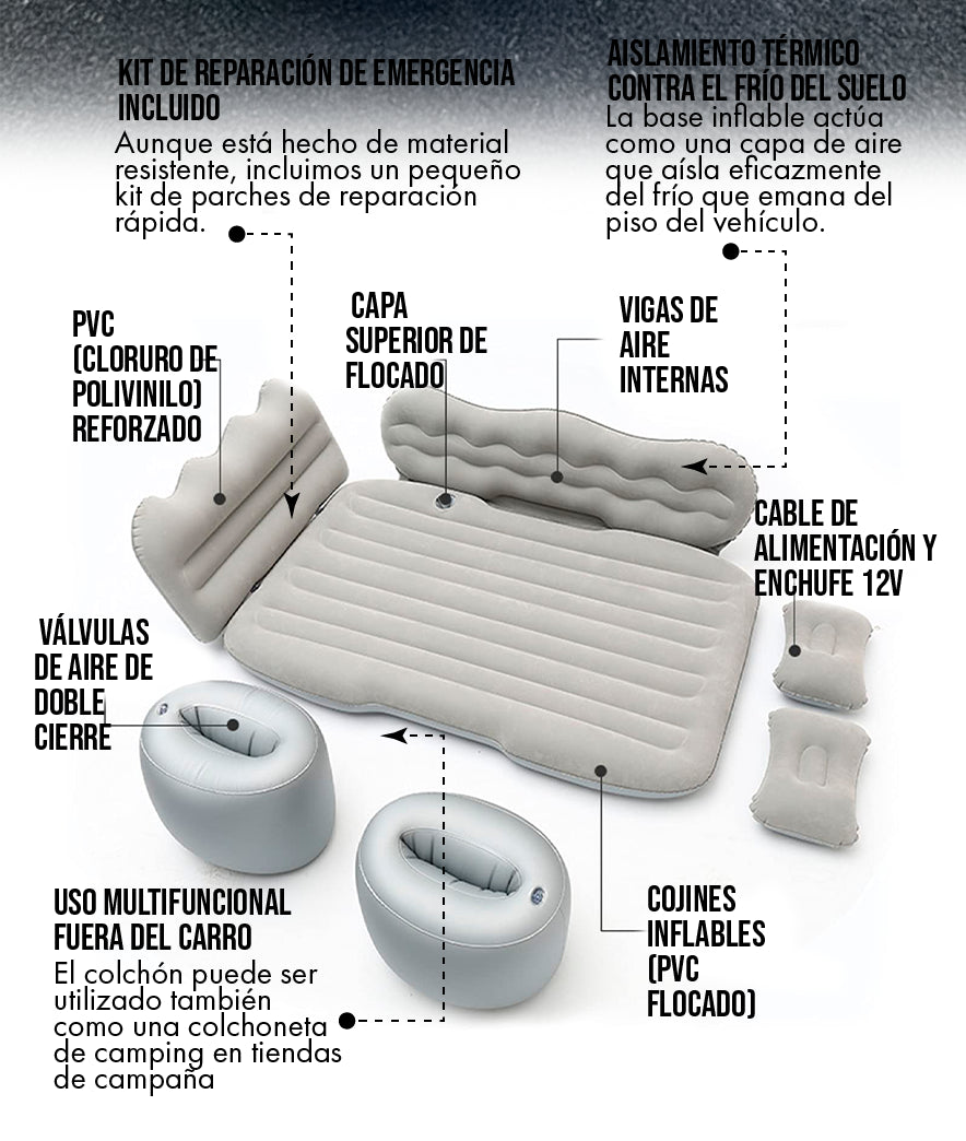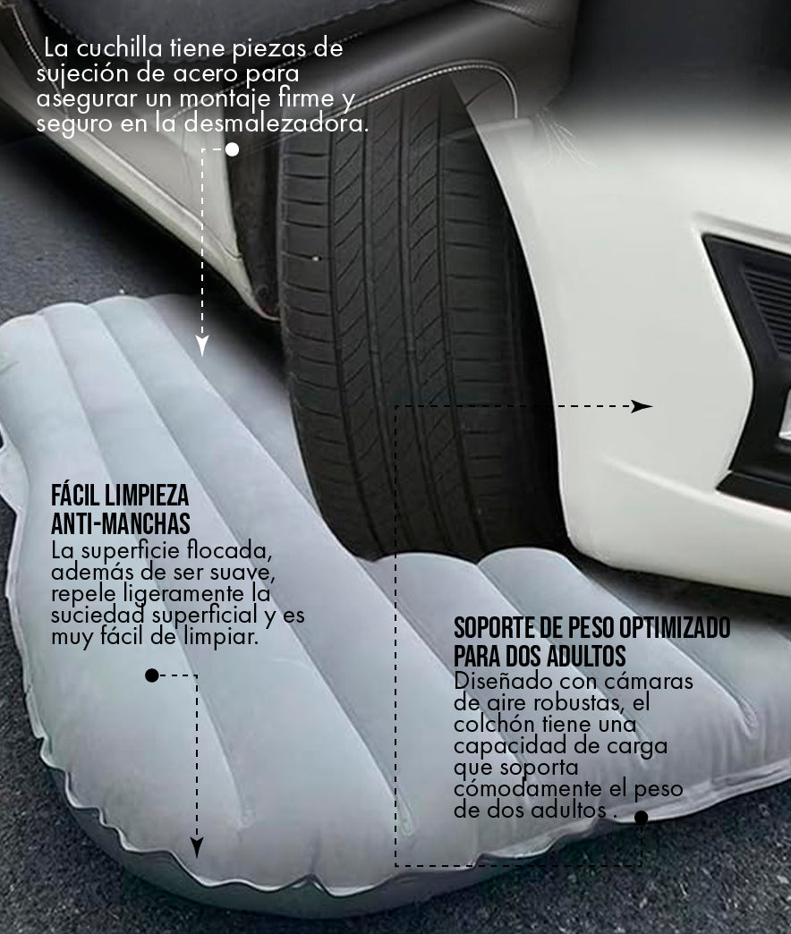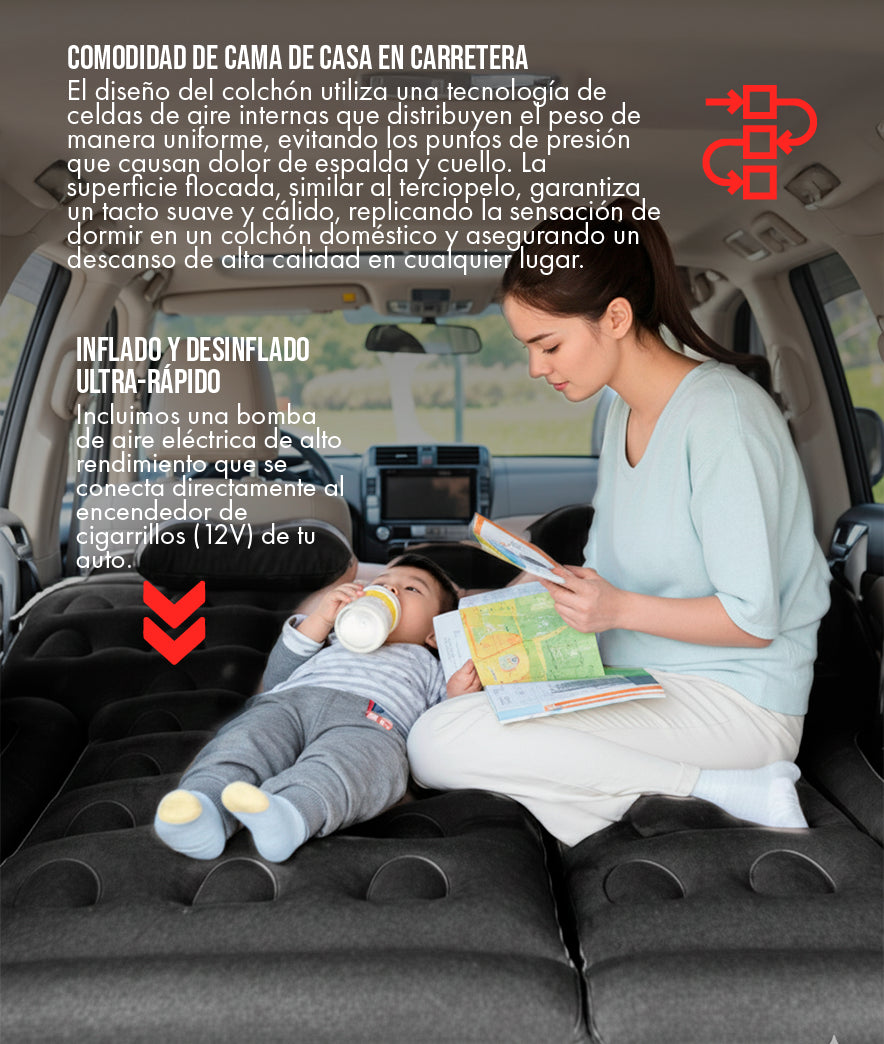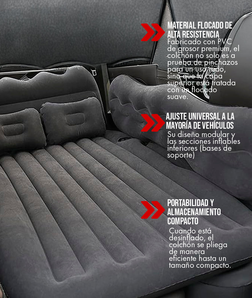 Sí, el diseño es universal. El colchón se compone de la sección principal y las bases de soporte inferiores que son las que se ajustan al espacio del piso. Gracias a su naturaleza inflable y modular, se adapta perfectamente a la mayoría de los sedanes, SUVs, mini vans y camionetas de doble cabina al crear una superficie de descanso plana. En vehículos más grandes como SUVs, tendrás más espacio a los lados, y en sedanes, llenará el ancho completo.