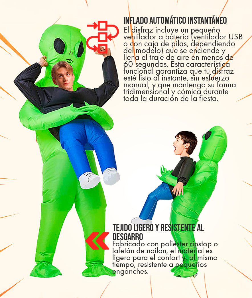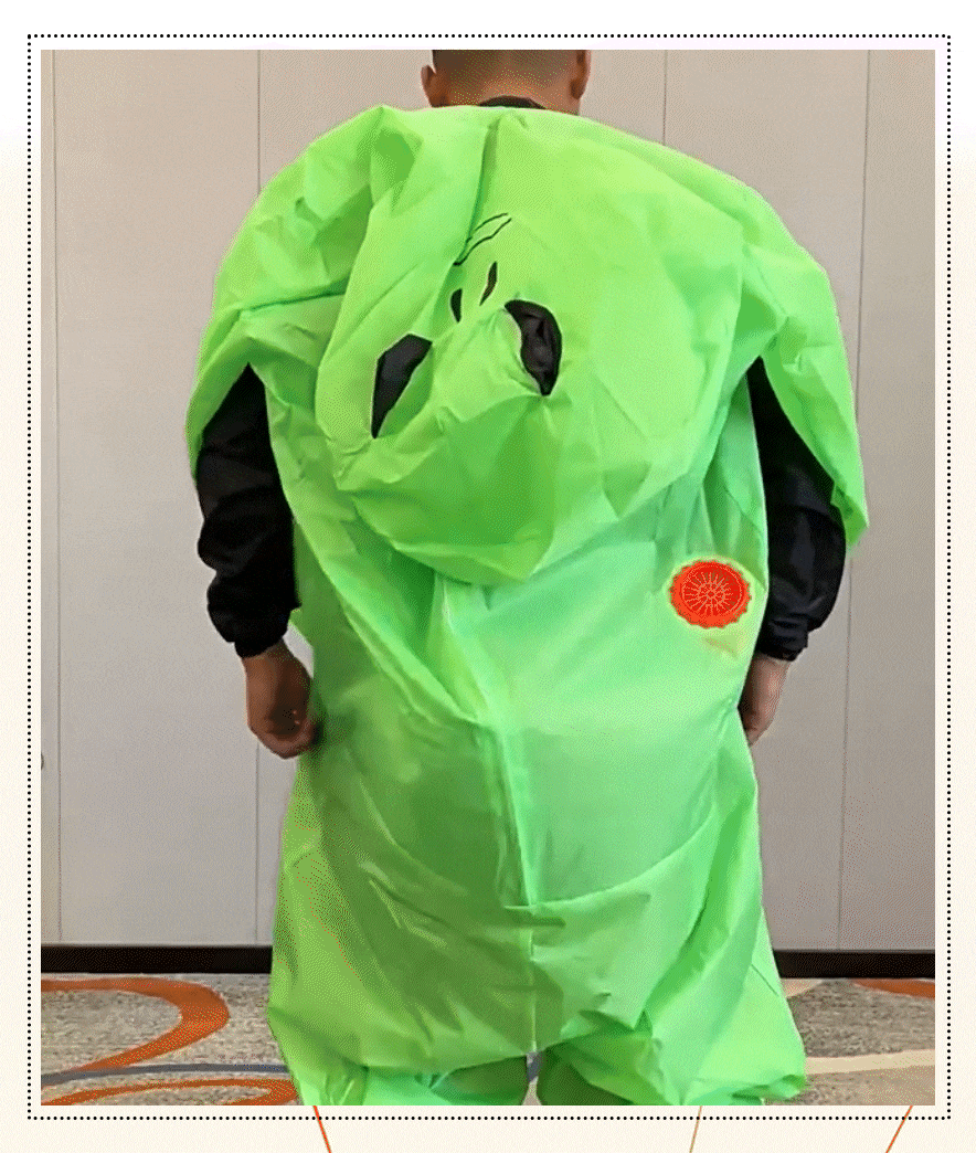 El disfraz se infla por completo en aproximadamente 45 a 60 segundos después de encender el ventilador y sellar todas las aberturas. Una vez inflado, el ventilador permanece encendido y mantiene la presión del aire. Solo necesitas encenderlo una vez por fiesta, y el flujo constante de aire asegura que la forma se mantenga firme y cómica durante todo el evento.