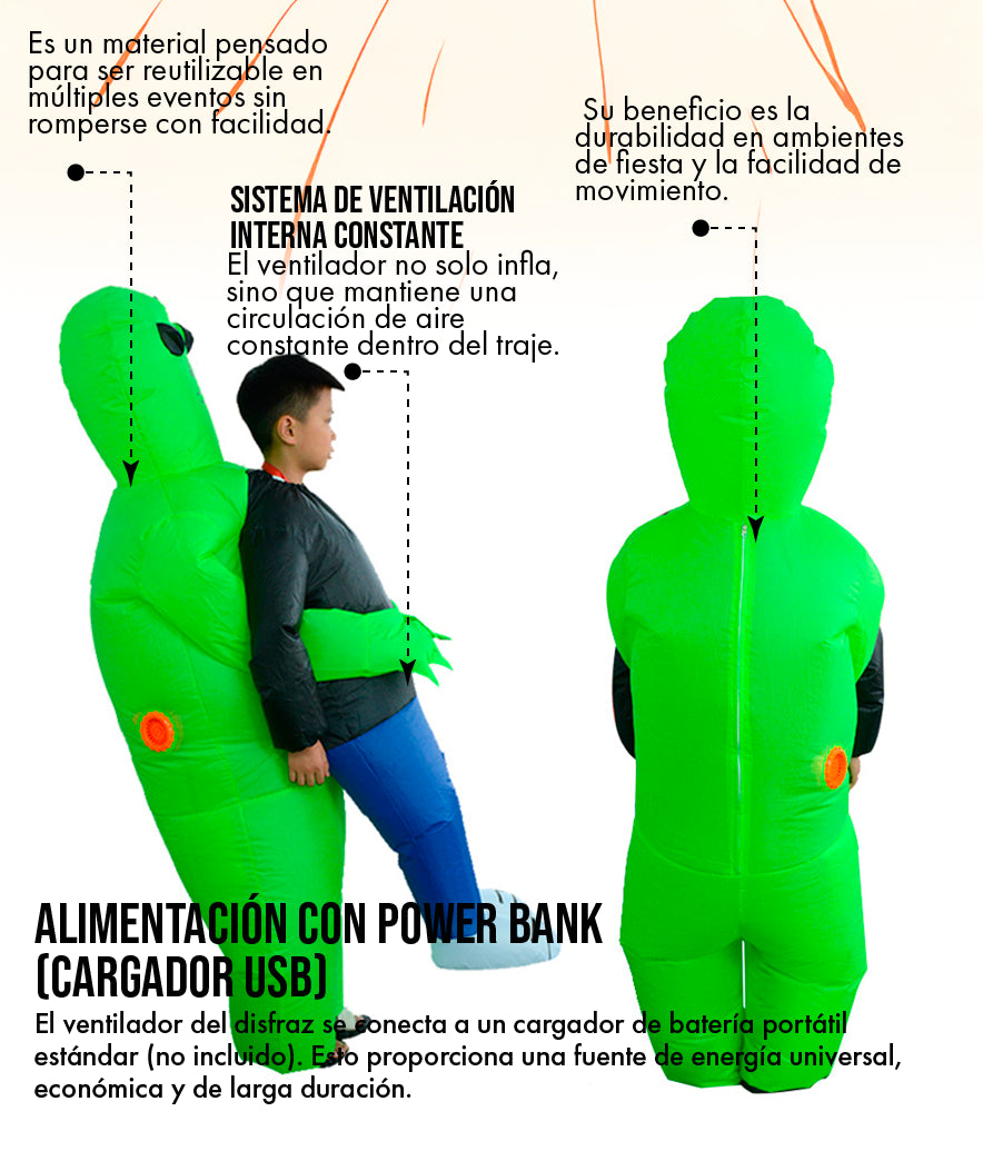 El disfraz requiere una fuente de energía constante para el ventilador incorporado. La característica clave de nuestro diseño es que se alimenta a través de un cable USB que se conecta a un Power Bank (cargador de batería portátil) estándar (no incluido). La mayoría de los clientes utilizan una batería de 10.000 mAh, que suele dar varias horas de uso continuo. No necesitas pilas costosas, solo tu cargador de celular portátil.