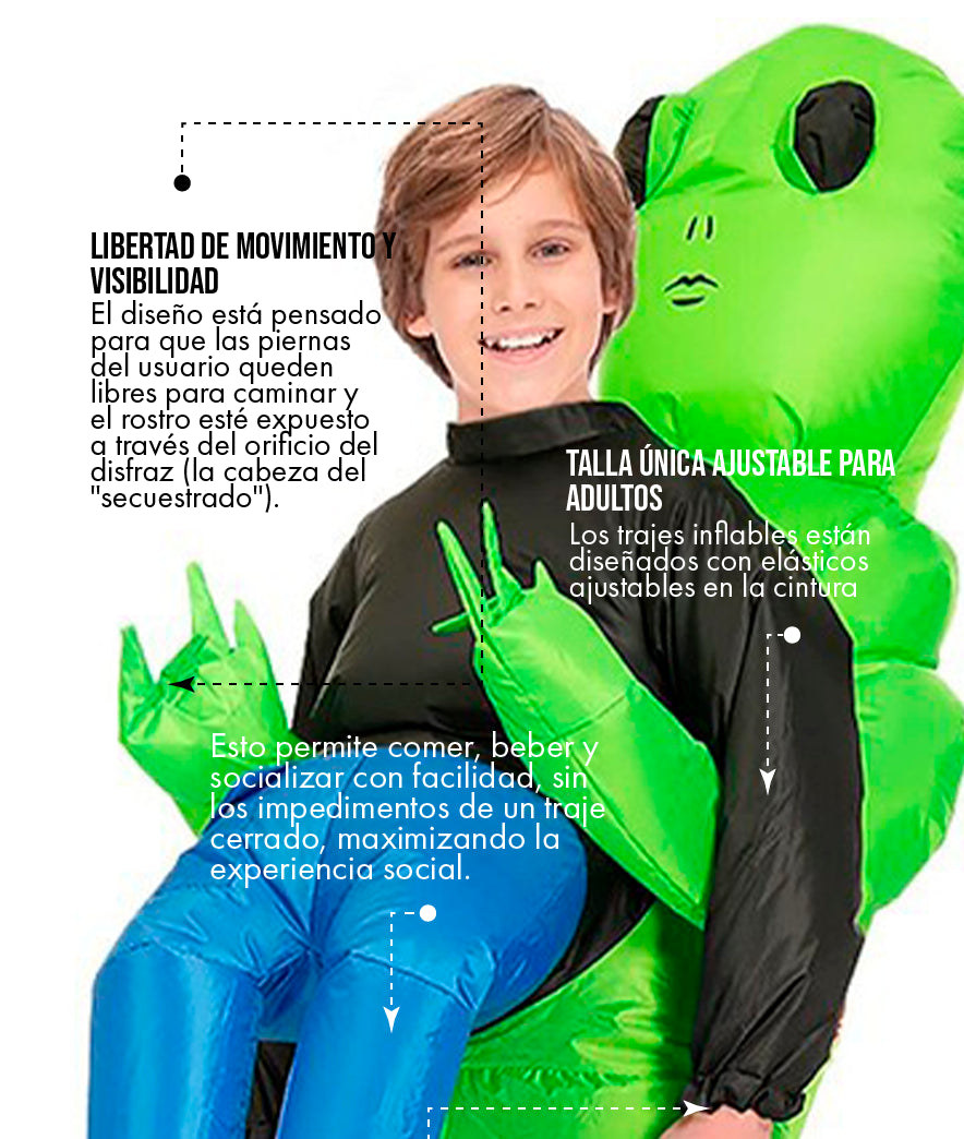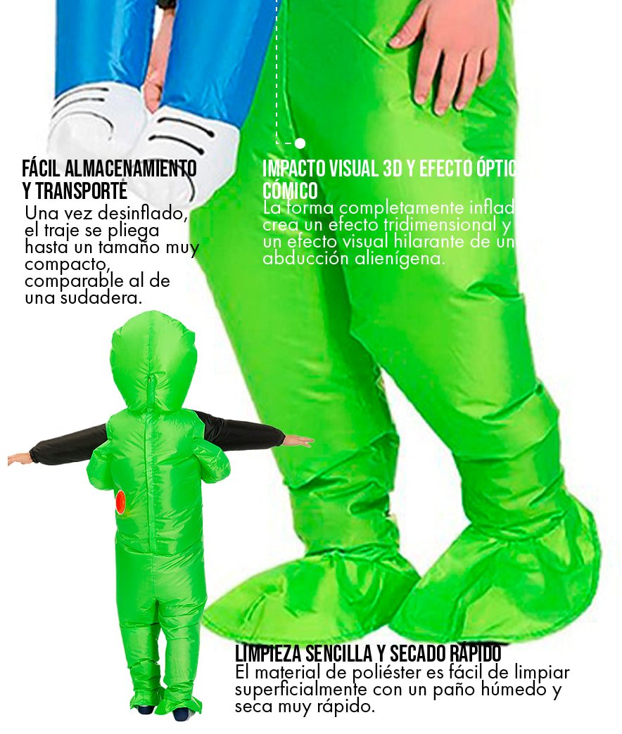 Sí, el disfraz está diseñado como talla única para adultos. Gracias a su naturaleza inflable y los cierres elásticos ajustables en la cintura, tobillos y muñecas, se sella y se adapta bien a la mayoría de las estaturas de adultos, desde aproximadamente 1.50 metros hasta 1.90 metros. La clave es sellar bien las aberturas para que el aire no se escape y el ventilador pueda mantener la presión.