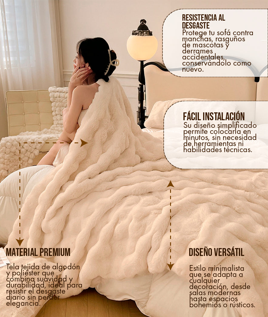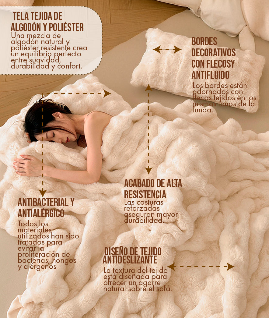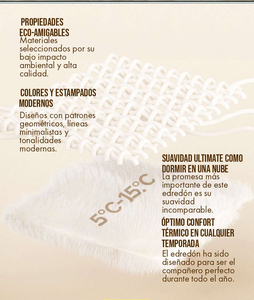 El Edredón Piel de Nube está confeccionado con una mezcla de algodón natural y poliéster de alta calidad. El algodón proporciona una suavidad y transpirabilidad excepcionales, mientras que el poliéster le da resistencia, durabilidad y un acabado que no se arruga fácilmente. El resultado es un material que combina lo mejor de ambos mundos para un confort inigualable.