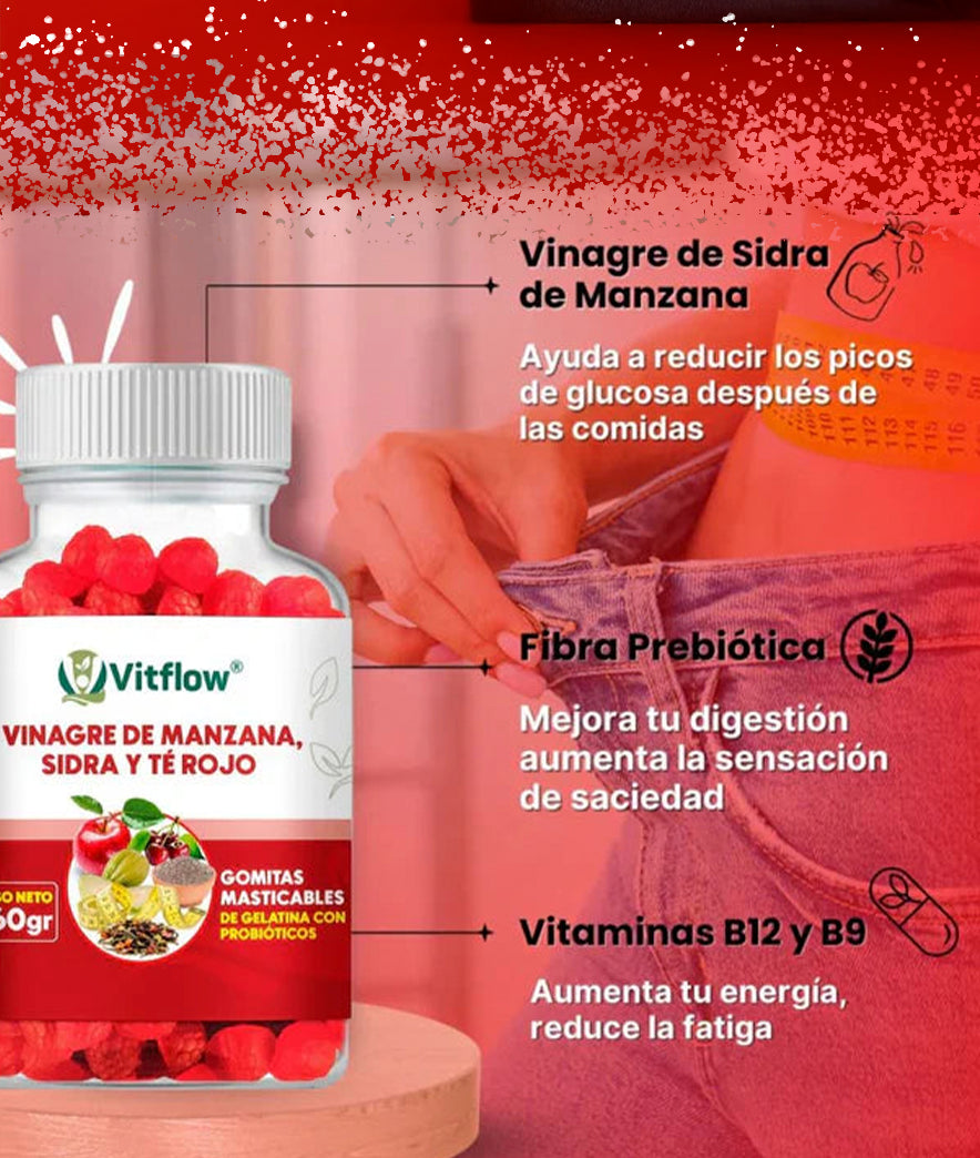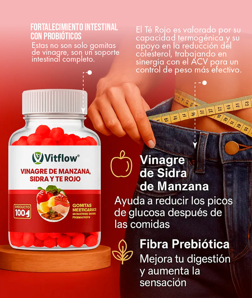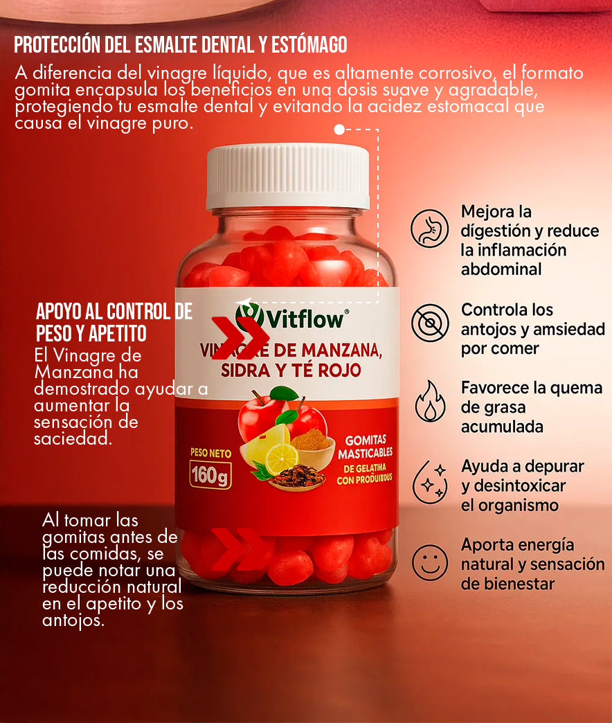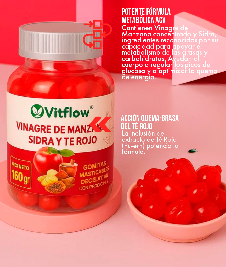 Cada gomita contiene una dosis concentrada de Vinagre de Manzana y Sidra. La concentración exacta está balanceada para proporcionar los beneficios metabólicos del ACV sin el riesgo de acidez o el sabor desagradable, asegurando la efectividad de la dosis diaria recomendada. (Se recomienda verificar la etiqueta para la concentración en mg).