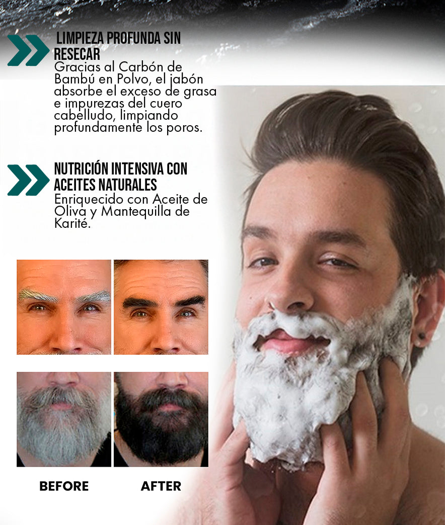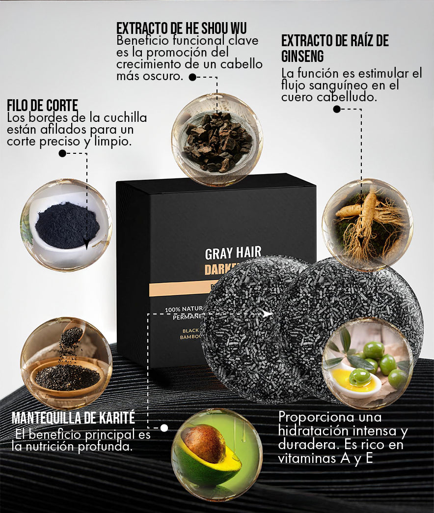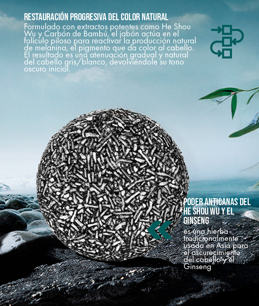 Sí, este jabón sólido reemplaza tu champú diario. Simplemente moja el cabello y frota la barra directamente sobre el cuero cabelludo y el cabello hasta obtener una espuma rica. Masajea y deja actuar de 2 a 5 minutos, permitiendo que los extractos naturales como el He Shou Wu y el Ginseng penetren. Luego, enjuaga.