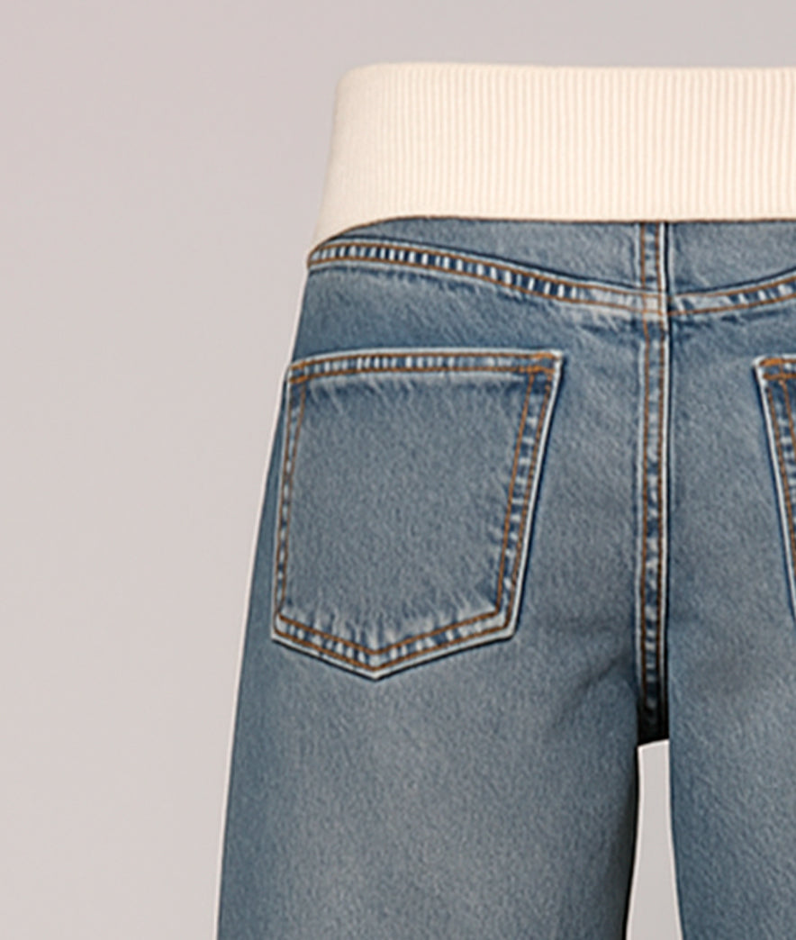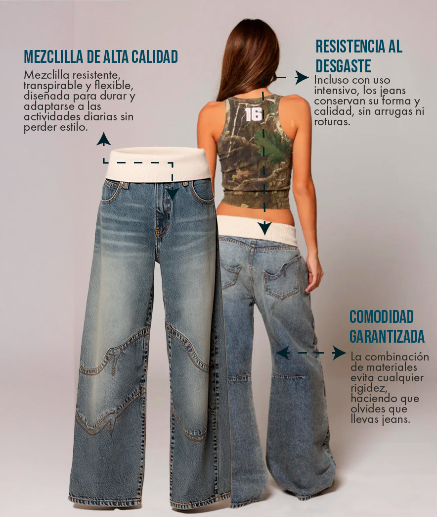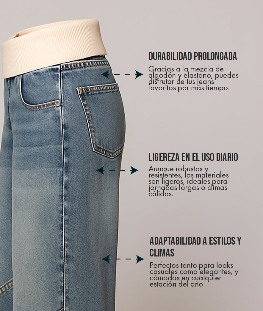 Nuestros Jeans WideWave están confeccionados con una mezcla de denim de alta calidad, compuesto principalmente por algodón con un porcentaje de elastano.