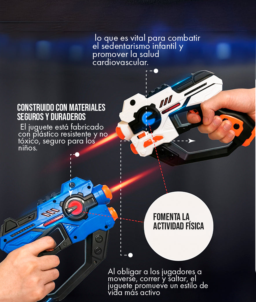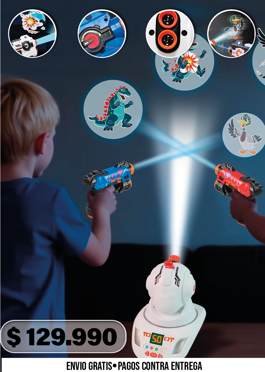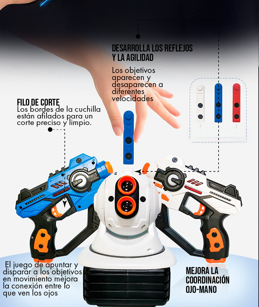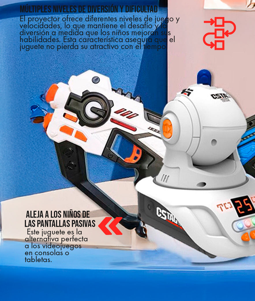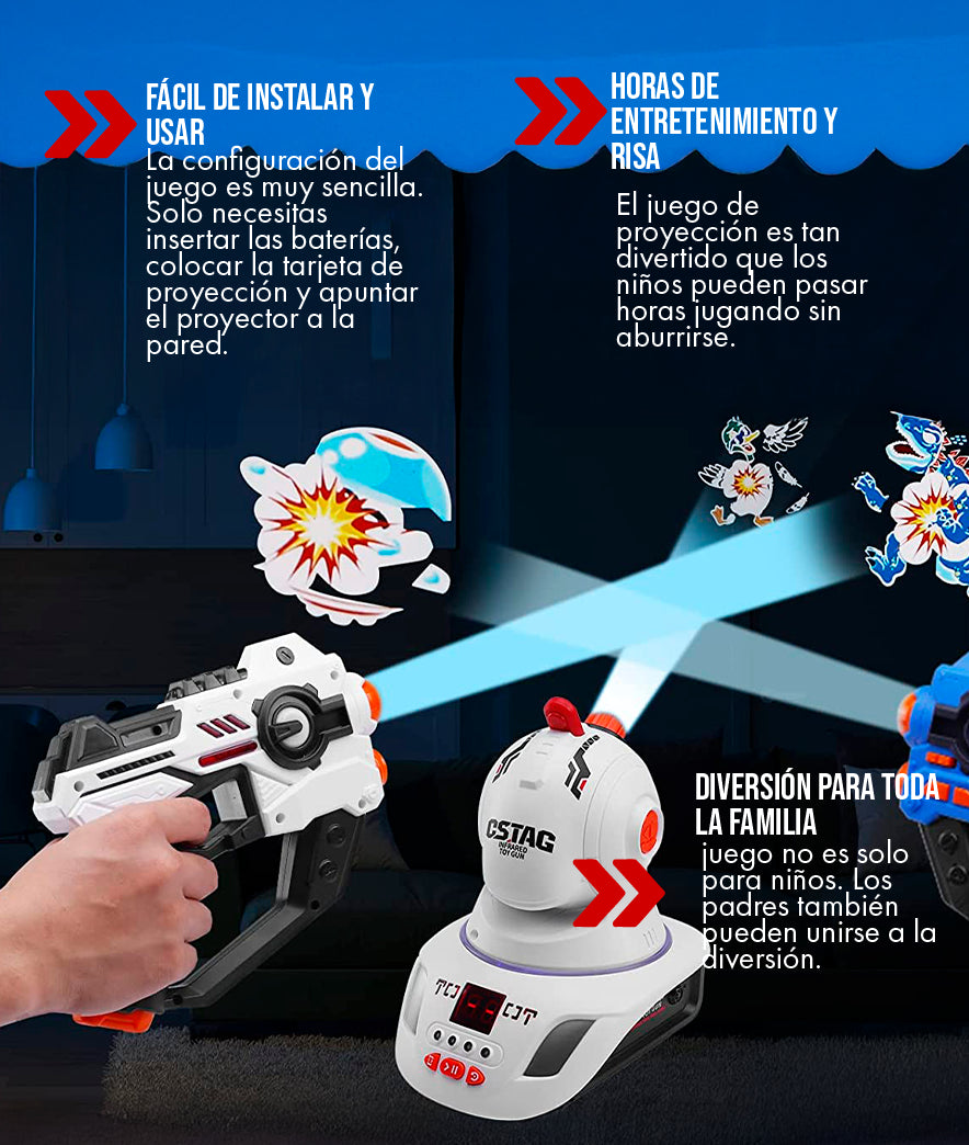 El set estándar incluye un proyector central, dos pistolas infrarrojas con sonido y sensor de disparo, y varias tarjetas con patrones de proyección intercambiables. Todo lo que necesitas para comenzar a jugar de inmediato.