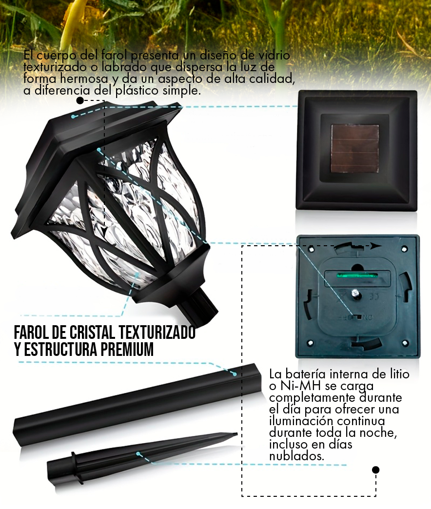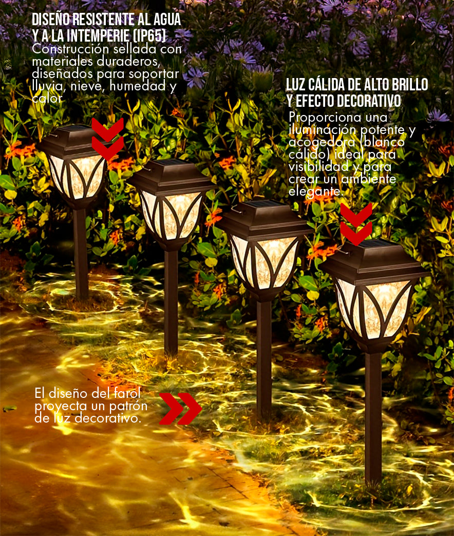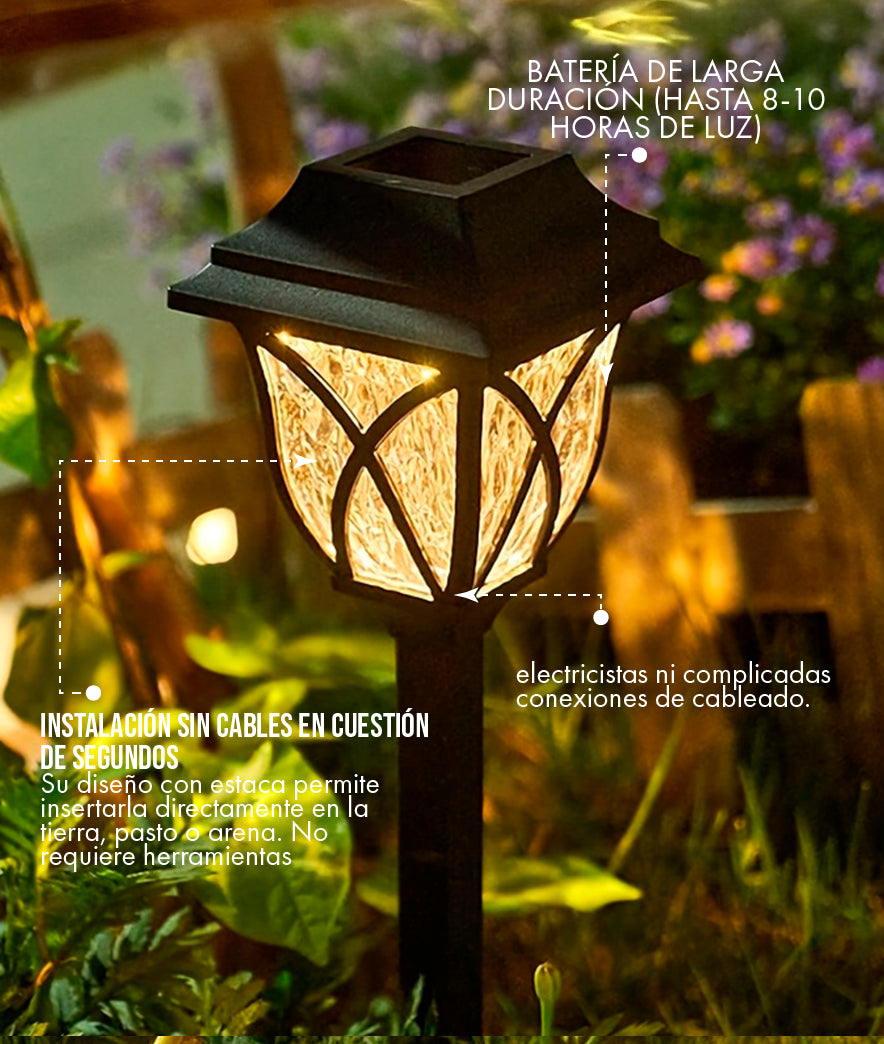 La batería de alto rendimiento garantiza hasta un 40% más de tiempo de iluminación (8-10 horas) en comparación con las luces solares estándar, asegurando que su jardín permanezca iluminado hasta el amanecer.