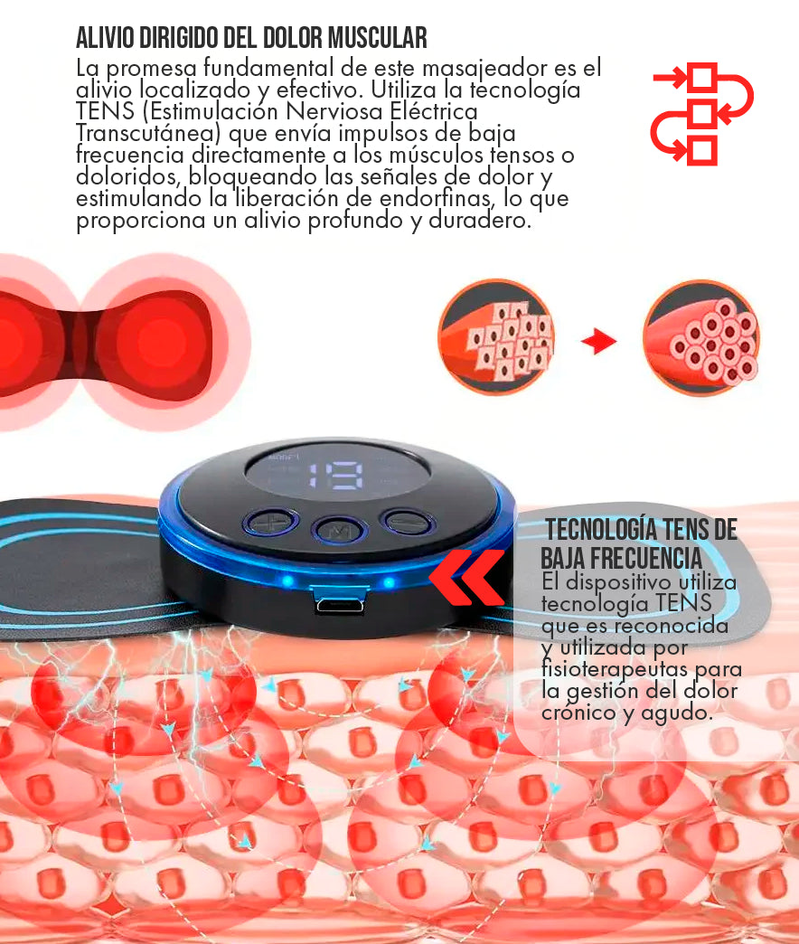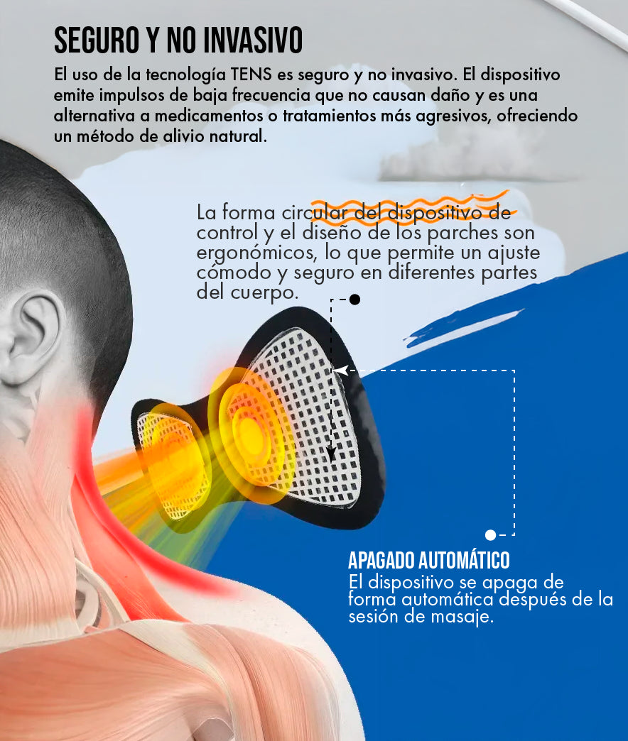 La tecnología TENS (Estimulación Nerviosa Eléctrica Transcutánea) es un método seguro y no invasivo para el alivio del dolor. Funciona enviando pequeños impulsos eléctricos a través de la piel, los cuales ayudan a bloquear las señales de dolor que llegan al cerebro y a estimular la producción de endorfinas, que son los analgésicos naturales del cuerpo.