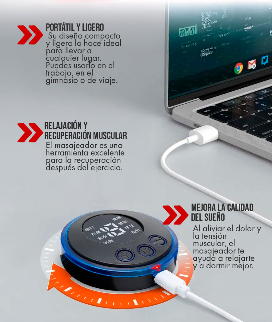 El masajeador es versátil y se puede usar en diversas áreas donde se acumula la tensión muscular. Es ideal para el cuello, los hombros, la espalda (cintura), los brazos y las piernas. Simplemente debes colocar los parches de gel en el área deseada para comenzar la terapia.