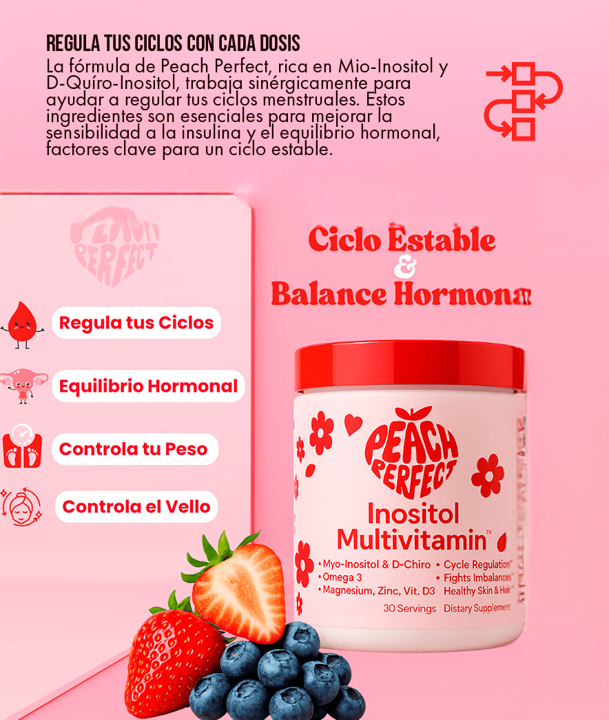 El Inositol es una vitamina del grupo B que desempeña un papel crucial en la comunicación celular y en la señalización de la insulina. Es fundamental para regular el metabolismo de la glucosa y la función hormonal. La combinación de Myo-Inositol y D-Chiro-Inositol en la proporción de 40:1, como la que se encuentra en Peach Perfect, ha demostrado ser la más efectiva para apoyar la salud hormonal, especialmente en casos de síndrome de ovario poliquístico (SOP).