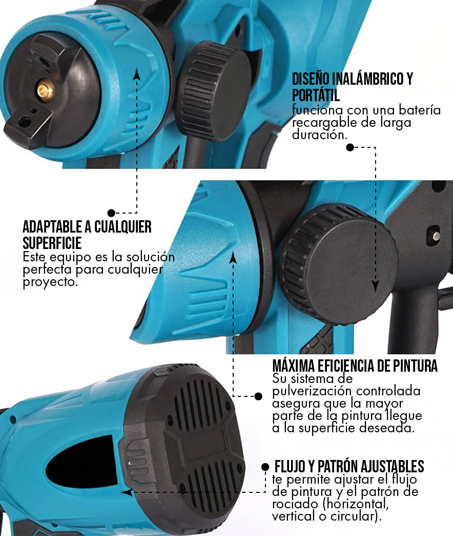 El pulverizador BIAONIU™ viene con una batería de litio de alta capacidad que ofrece un rendimiento prolongado. La duración de la batería varía según la densidad de la pintura y la intensidad de uso, pero en promedio, puede darte de 45 a 60 minutos de uso continuo, suficiente para pintar una pared completa. La carga completa toma aproximadamente 2 horas, para que puedas volver a trabajar rápidamente.