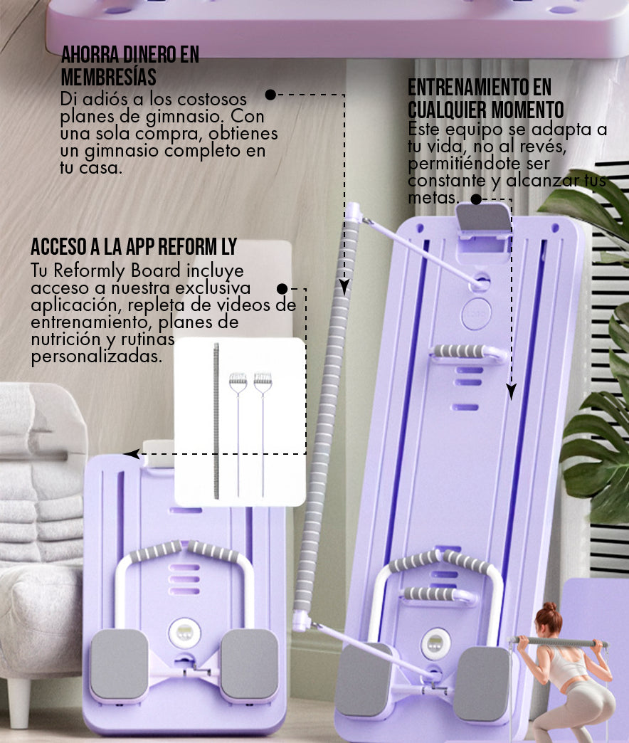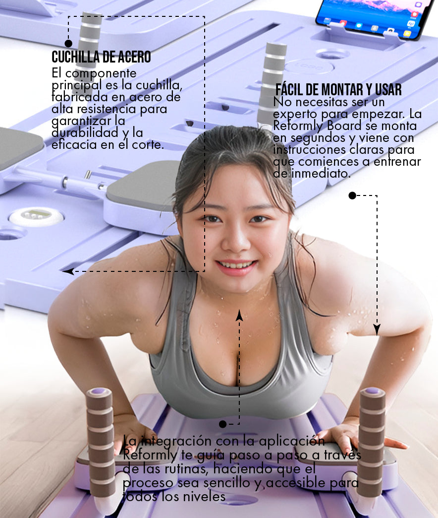 La Reformly Fitness Board es una plataforma de ejercicios multifuncional diseñada para llevar un estudio de pilates, yoga y entrenamiento de fuerza a tu hogar. Su diseño innovador y compacto integra una base estable, bandas de resistencia, asas ergonómicas y una barra para los pies. Con este equipo, puedes realizar una amplia variedad de ejercicios que se centran en el fortalecimiento del core, la tonificación muscular, la mejora de la flexibilidad y el equilibrio. Las rutinas van desde ejercicios de pilates clásico, como el 'teaser' y la 'sirena', hasta entrenamientos de fuerza para brazos y piernas. Es ideal para una rutina completa y diversa.