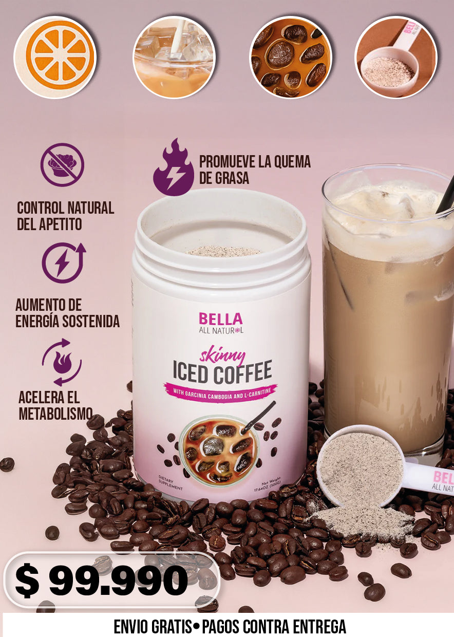 Bella All Natur®l Skínny Iced Coffee es un suplemento dietético en polvo, diseñado para ser mezclado con agua fría o leche y disfrutado como un delicioso café helado. Su fórmula única combina los beneficios del café con ingredientes activos como la Garcinia Cambogia y la L-Carnitina. Sirve como un apoyo integral para la pérdida de peso, ayudando a controlar el apetito, aumentar la energía, acelerar el metabolismo y promover la quema de grasas. Es tu aliado perfecto para un estilo de vida más saludable y una figura más esbelta.