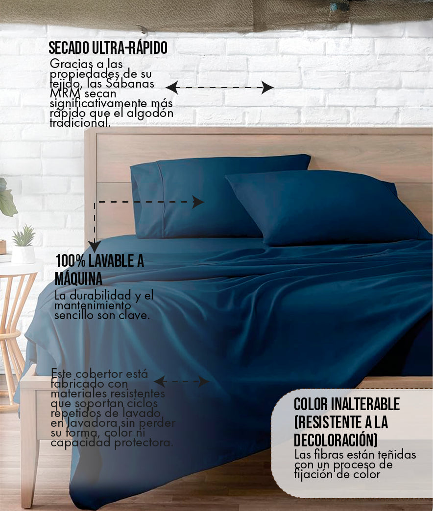 Las Sábanas MRM están confeccionadas con una microfibra de alta densidad y doble cepillado, lo que les confiere una suavidad superior y una sensación de "piel de durazno" que a menudo es más cómoda que muchos algodones de bajo y medio conteo de hilos. A diferencia del algodón, esta microfibra es naturalmente hipoalergénica, más resistente a las manchas y mucho más fácil de secar, manteniendo su forma y color por mucho más tiempo.
