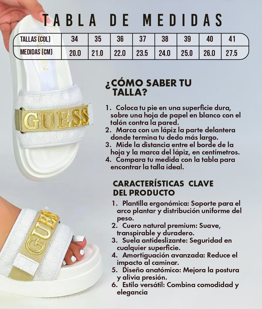Recomendamos que elijas la talla que usas habitualmente. El diseño de las sandalias se ajusta a las medidas estándar. Si estás entre dos tallas, te sugerimos que elijas la más grande para asegurar un ajuste más cómodo, especialmente en días calurosos cuando los pies tienden a hincharse ligeramente.