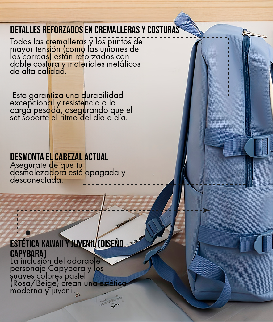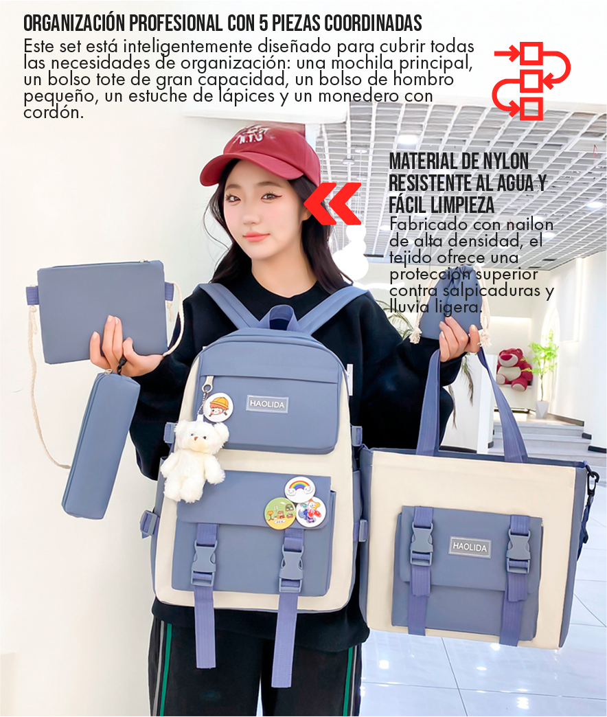 El set está confeccionado con Nylon de alta densidad con tratamiento de resistencia al agua. Esto significa que es altamente eficaz contra salpicaduras, lluvia ligera y humedad. El agua se desliza sobre la superficie, protegiendo tus libros y dispositivos. Sin embargo, no es sumergible, por lo que no recomendamos exponerlo a fuertes aguaceros por tiempo prolongado.