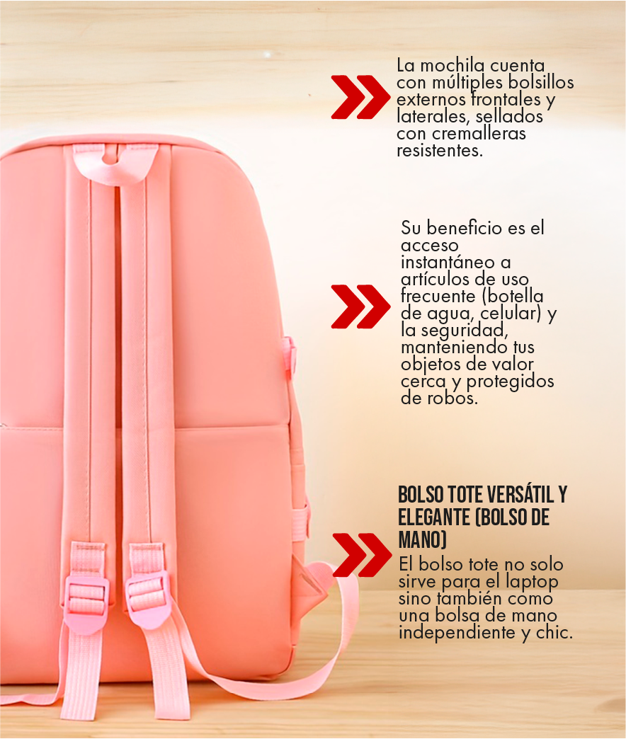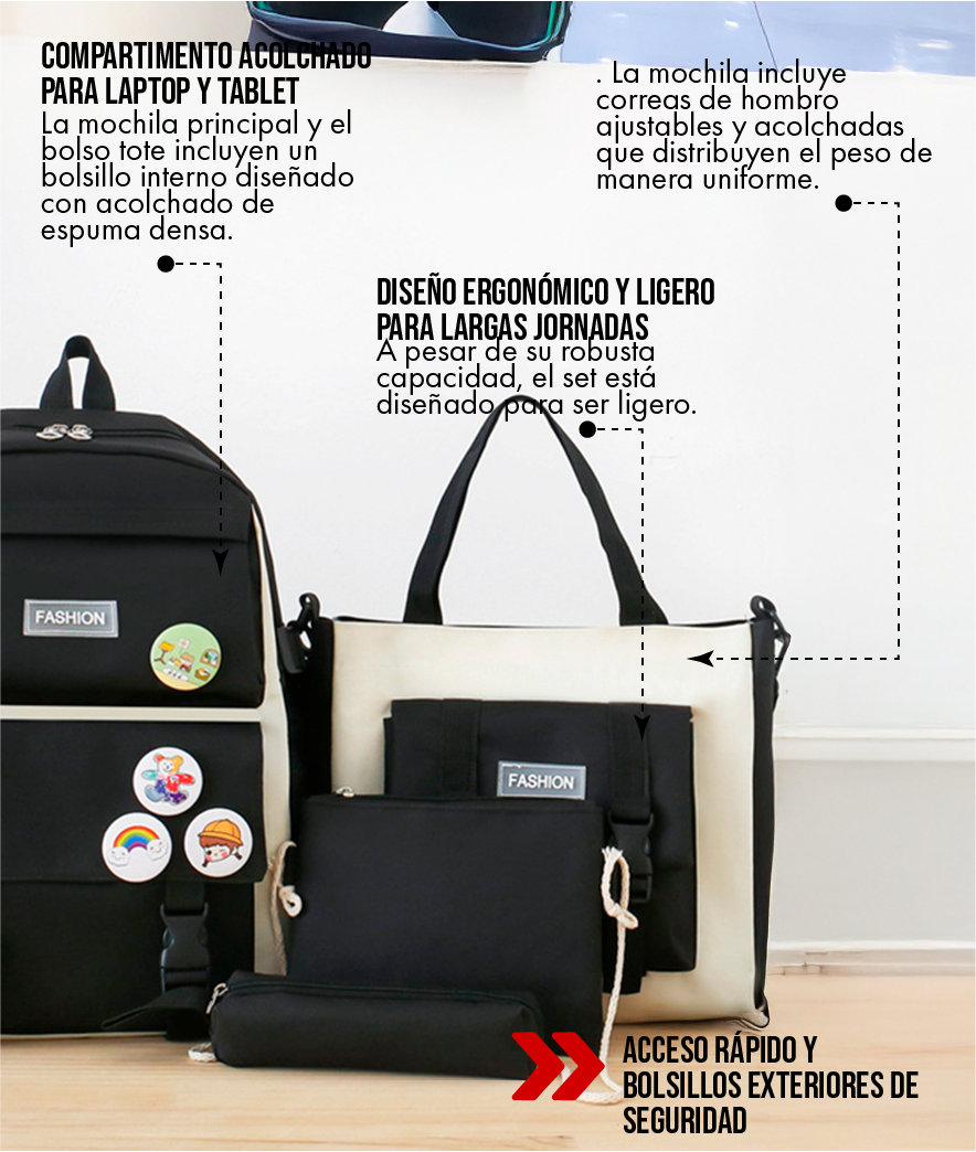 La mochila principal está diseñada con un compartimento acolchado que se ajusta perfectamente a laptops de hasta 15.6 pulgadas. El bolso tote de mano también es lo suficientemente amplio para transportar una tablet grande o un laptop delgado de 14 pulgadas. Las dimensiones internas están optimizadas para asegurar que tus dispositivos encajen cómodamente y queden protegidos.
