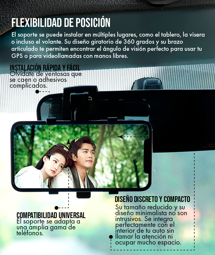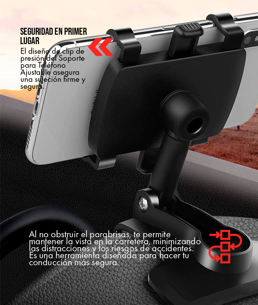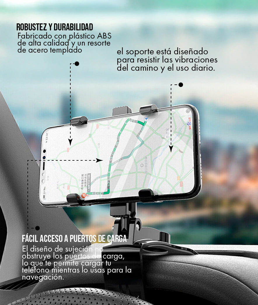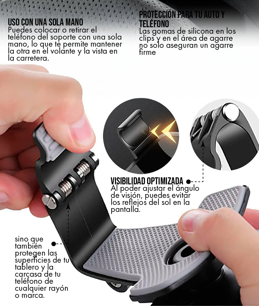 La instalación es muy sencilla y no requiere ninguna herramienta. El soporte tiene un clip de presión que se abre para sujetarse firmemente al borde del tablero de tu carro. Simplemente ubícalo en el lugar deseado, presiona el clip para abrirlo y colócalo en su posición. La sujeción es instantánea y segura.
